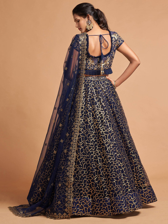 Navy blue and beige embroidered lehenga choli with dupatta, zari