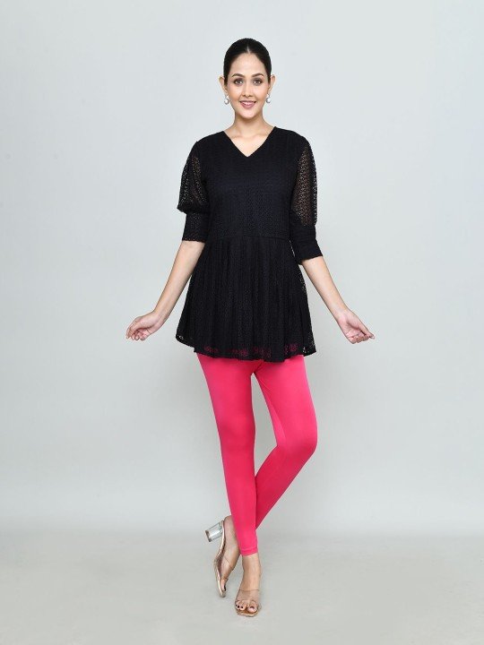 Pink solid ankle-length leggings, has an elasticated waistband with slip-on closure