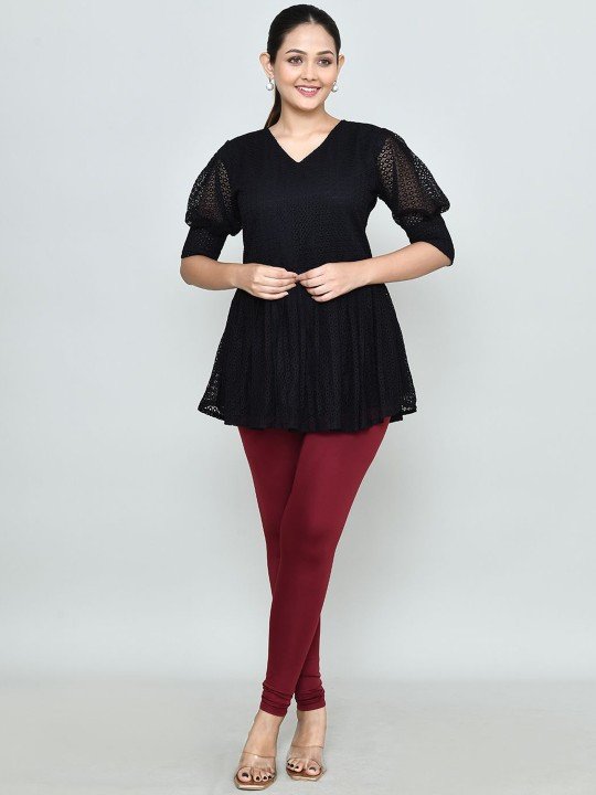 Maroon solid Churidar-length leggings, has an elasticated waistband with slip-on closure