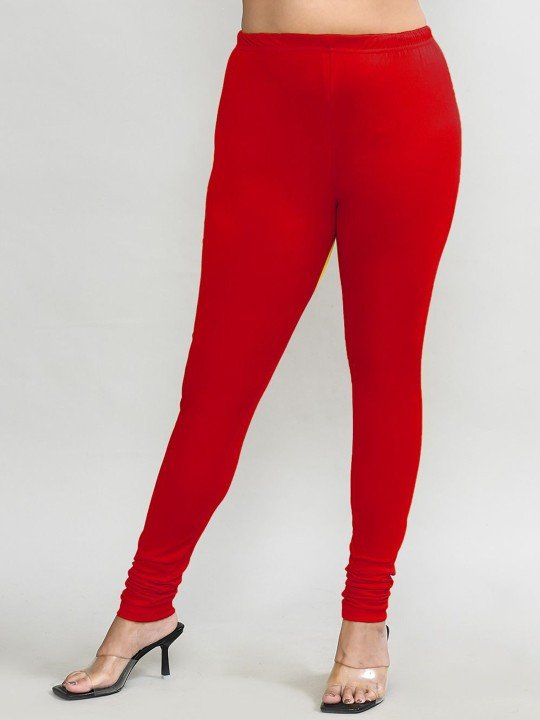 Red solid regular-sit mid-rise churidar length leggings, has an elasticated waistband and slip on closure