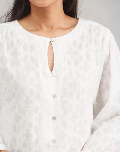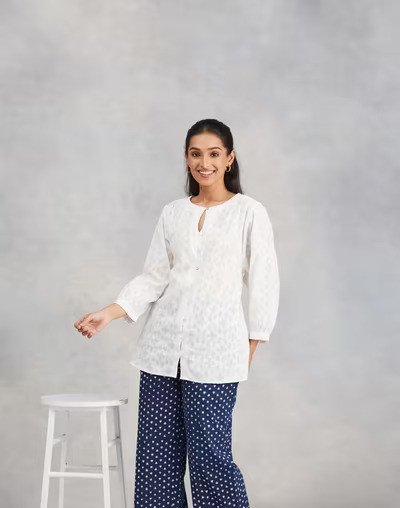 Cotton tunic made for everyday comfort, with a soft handfeel and relaxed construction. A front button placket and subtle keyhole neckline give it just enough structure, while three-quarter sleeves and longline shape offer graceful coverage. Tonal patterns lend understated charm. Combine with patterned pyjamas or solid leggings, and accessorise with fabric juttis or silver studs for a laid-back yet considered ensemble.
