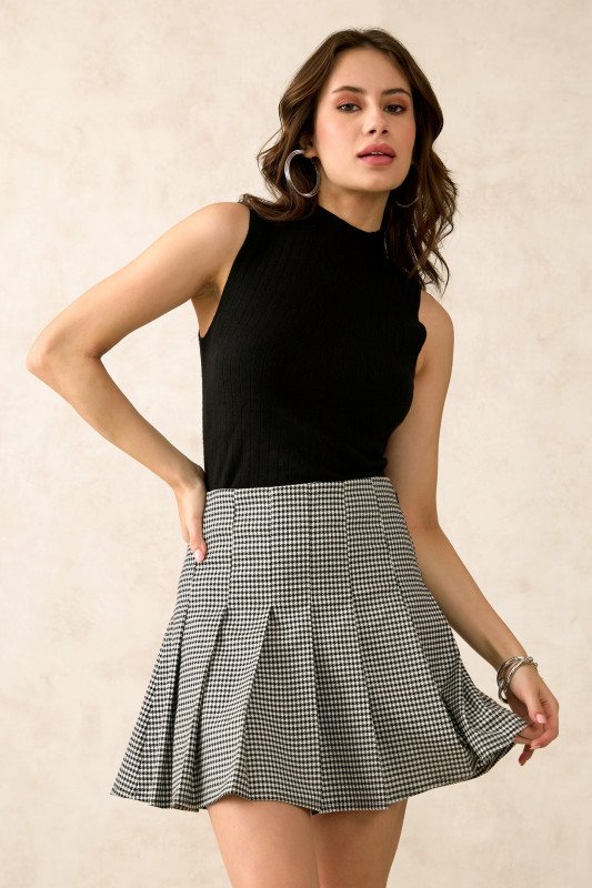Black And White Checked Mini Skirt Features A Classic Pleated Design With A Flattering Fit-And-Flare Silhouette.