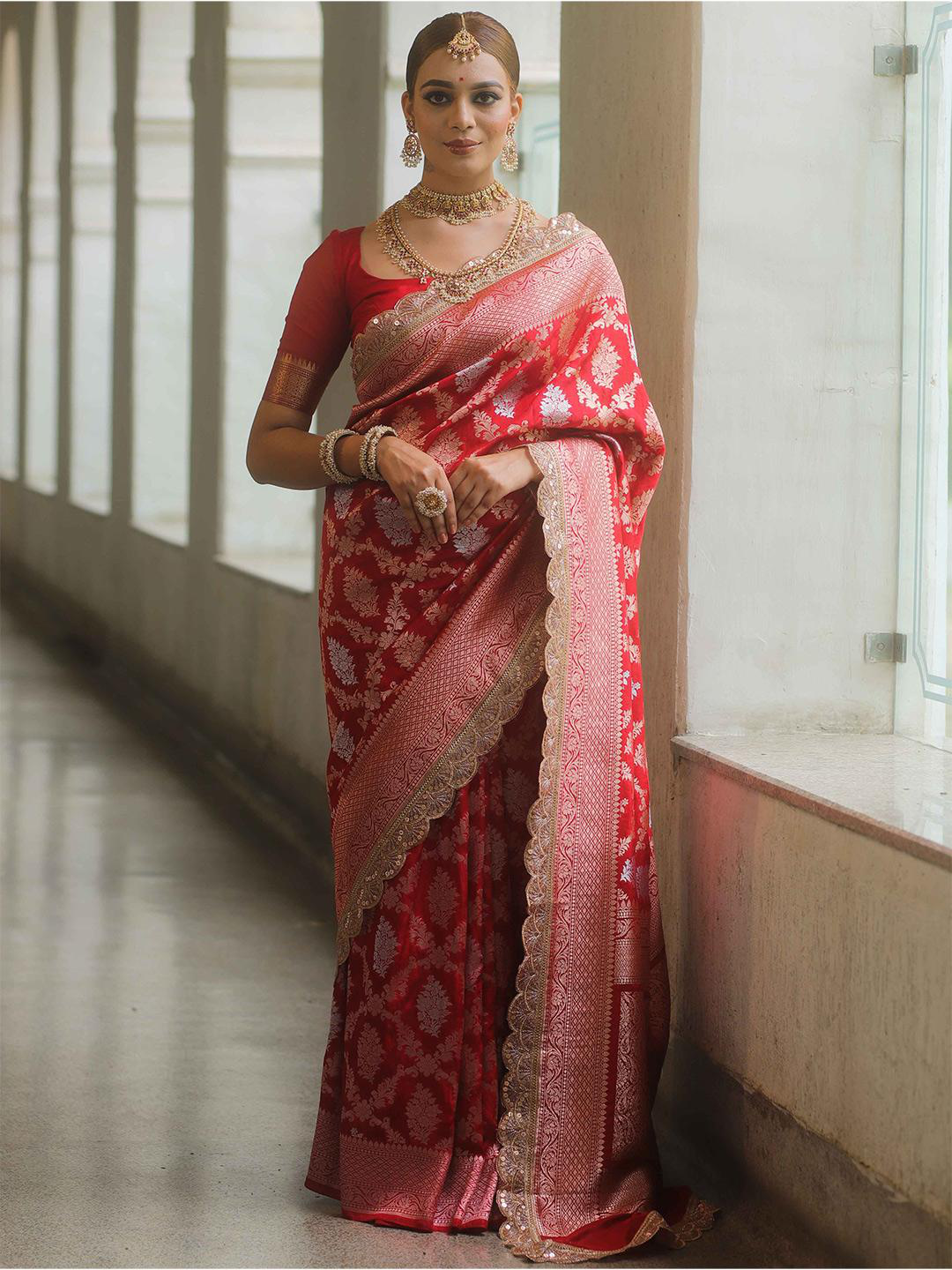 The blouse worn by the model might be for modelling purpose only. Check the image of the blouse piece to understand how the actual blouse piece looks like.